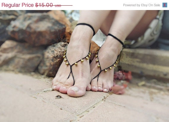 MOTHERS Day SALE Indie Gold drop black barefoot sandals. Sexy Bellydance foot jewelry.